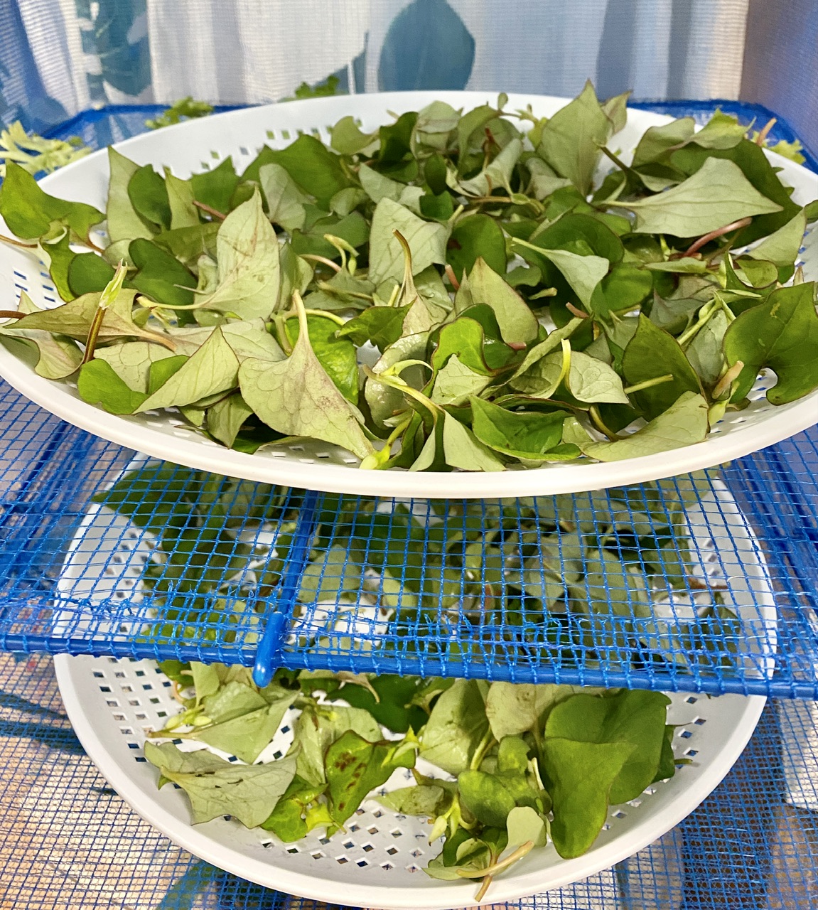 ドクダミはようやく枝を取って洗って、ざるにあげて乾燥のところまで漕ぎつけました。