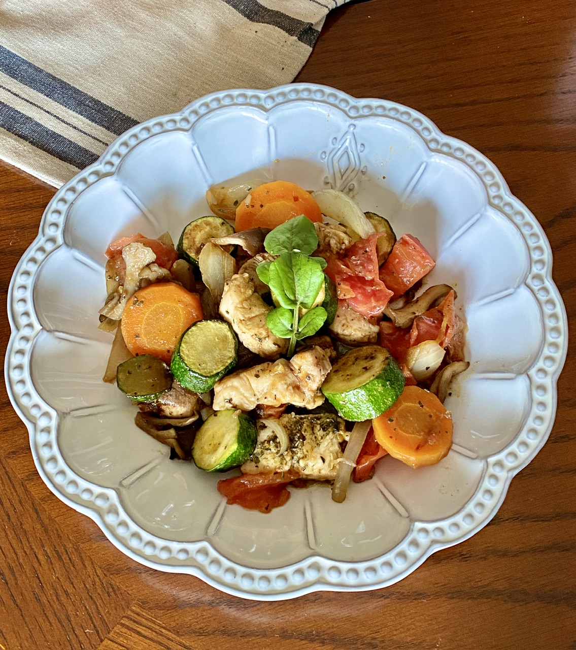 ズッキーニや人参、玉ねぎ、トマトをいれてオレガノ、バジル、タイム、ニンニクなどを入れて塩味にしました。その方がサメを味わえるので。