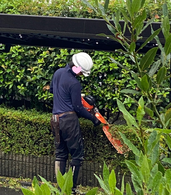 急に外ですごい轟音が続くので見てみたらお向かいさんの道路の庭木を剪定している業者の方がいました。