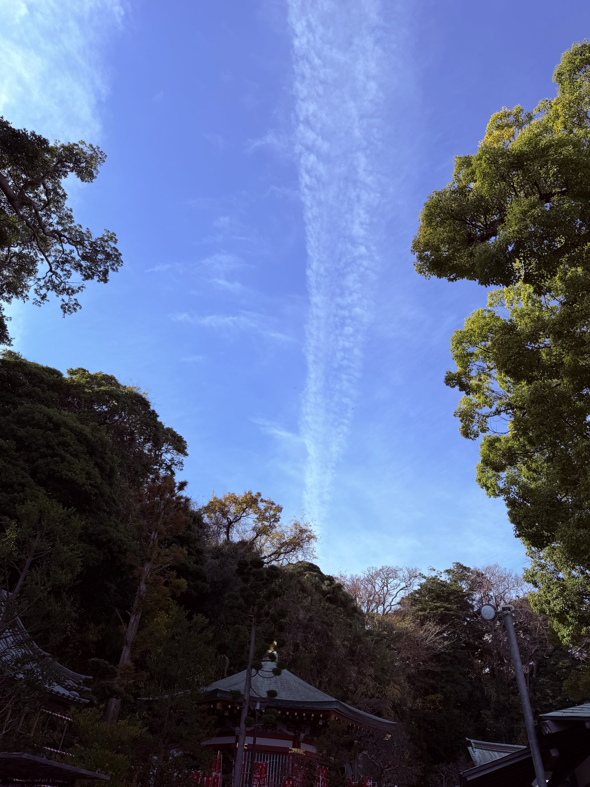 江島神社に到着した弁財天様の上を見上げると美しい光が現れました。