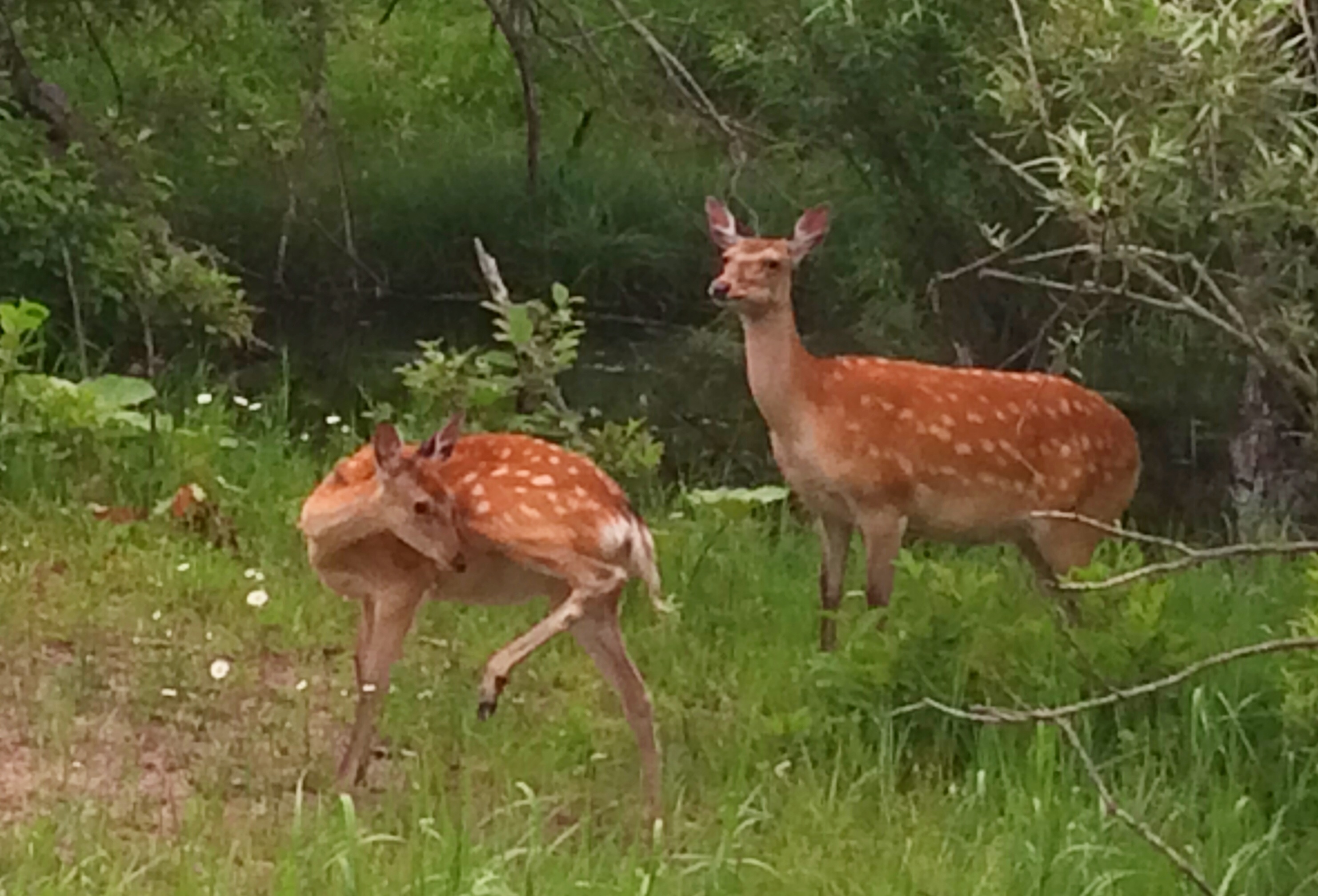 キタキツネのお母さんと子どもに会いました。子ぎつねは私を見るとビックリして巣穴に潜っていきました。