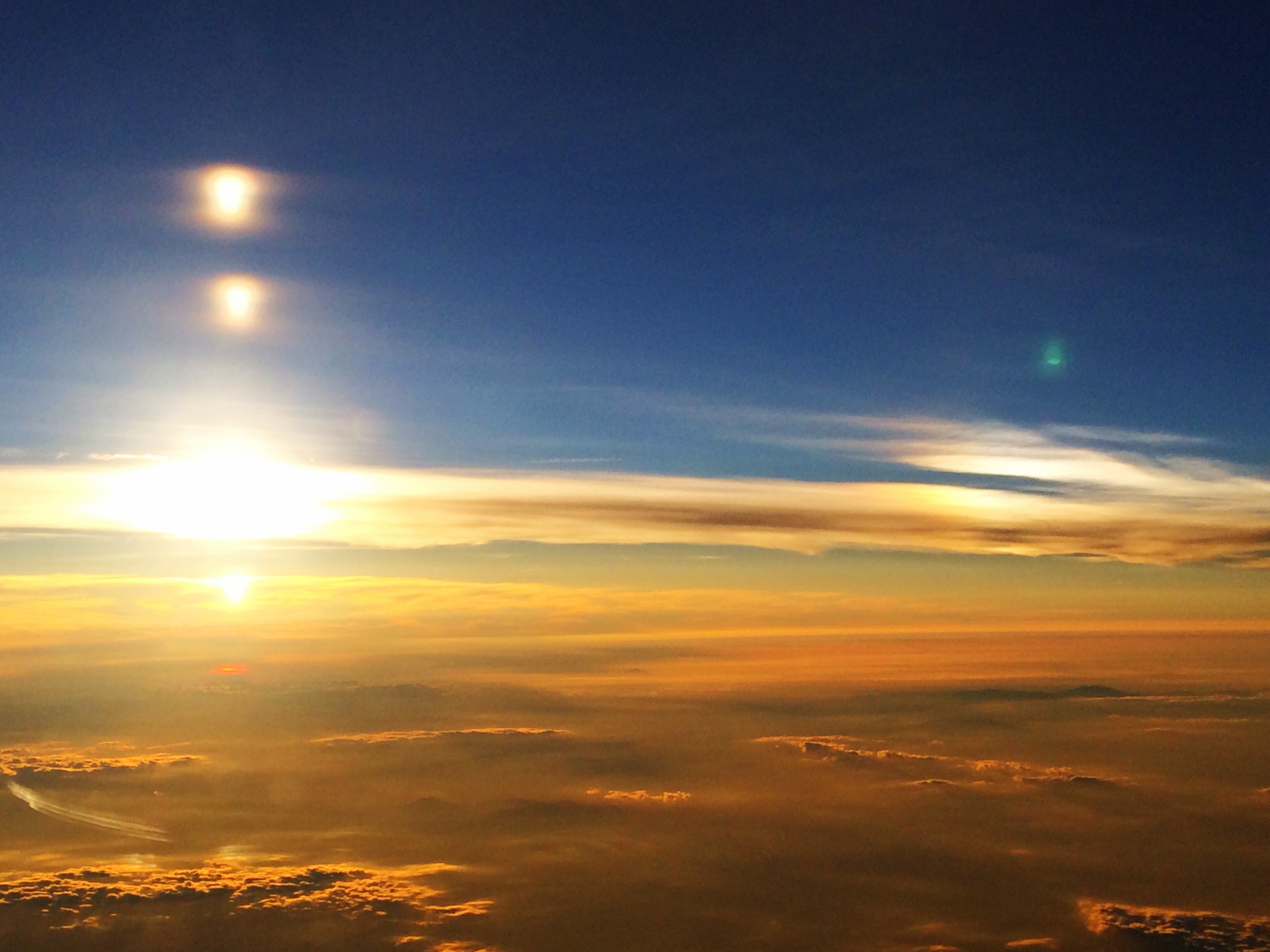 スマホでうまく映りませんが太陽の両サイドに虹色の光の柱が立っていました。かなり長い間。