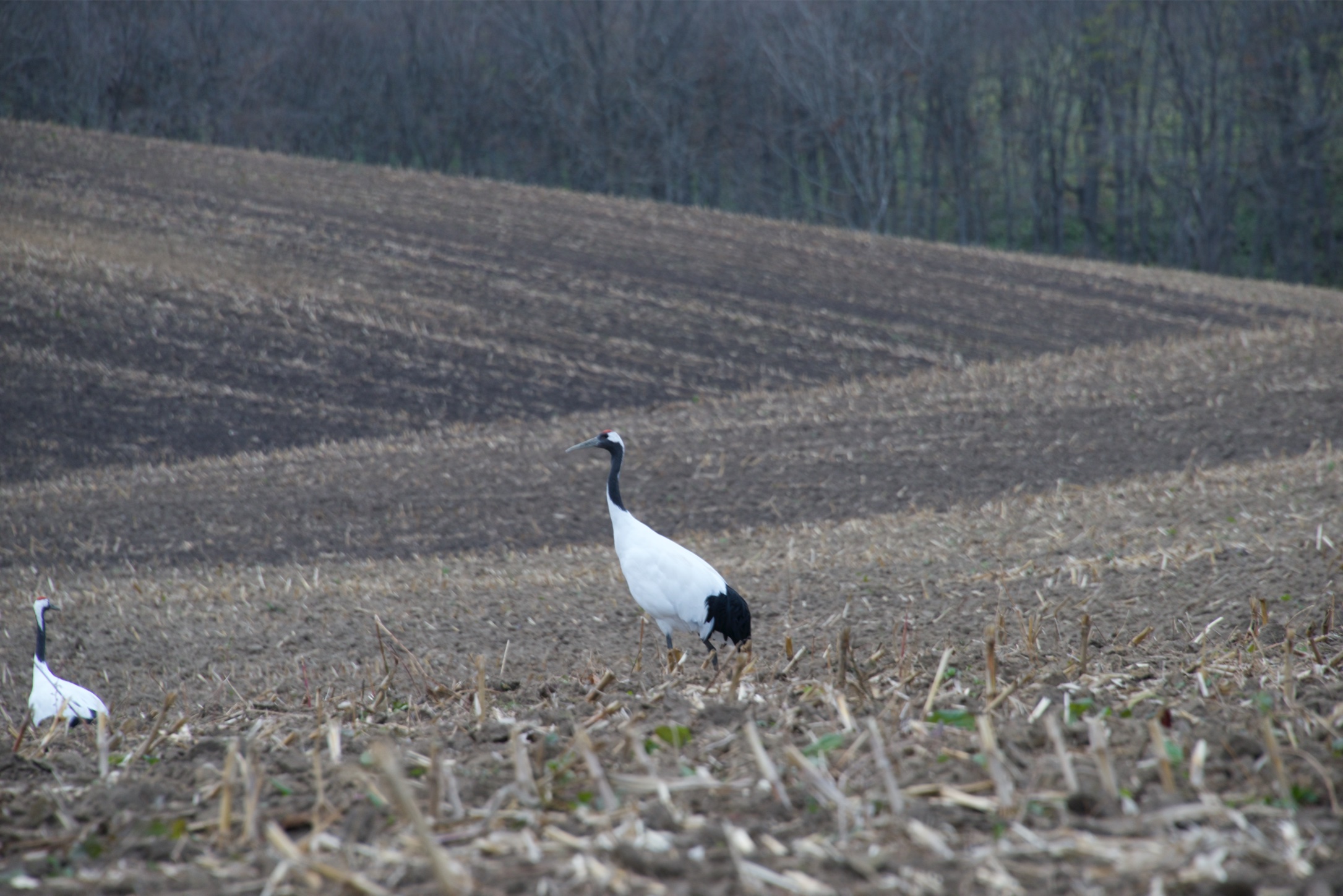 トウモロコシを刈り取った畑で落ち葉拾いする丹頂たち。