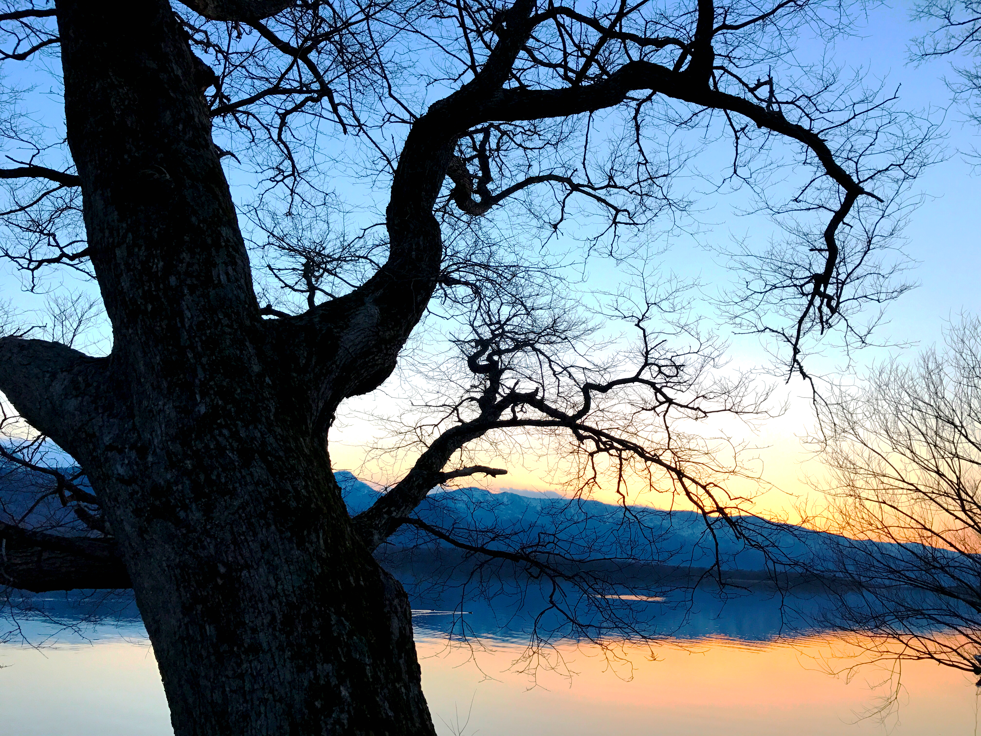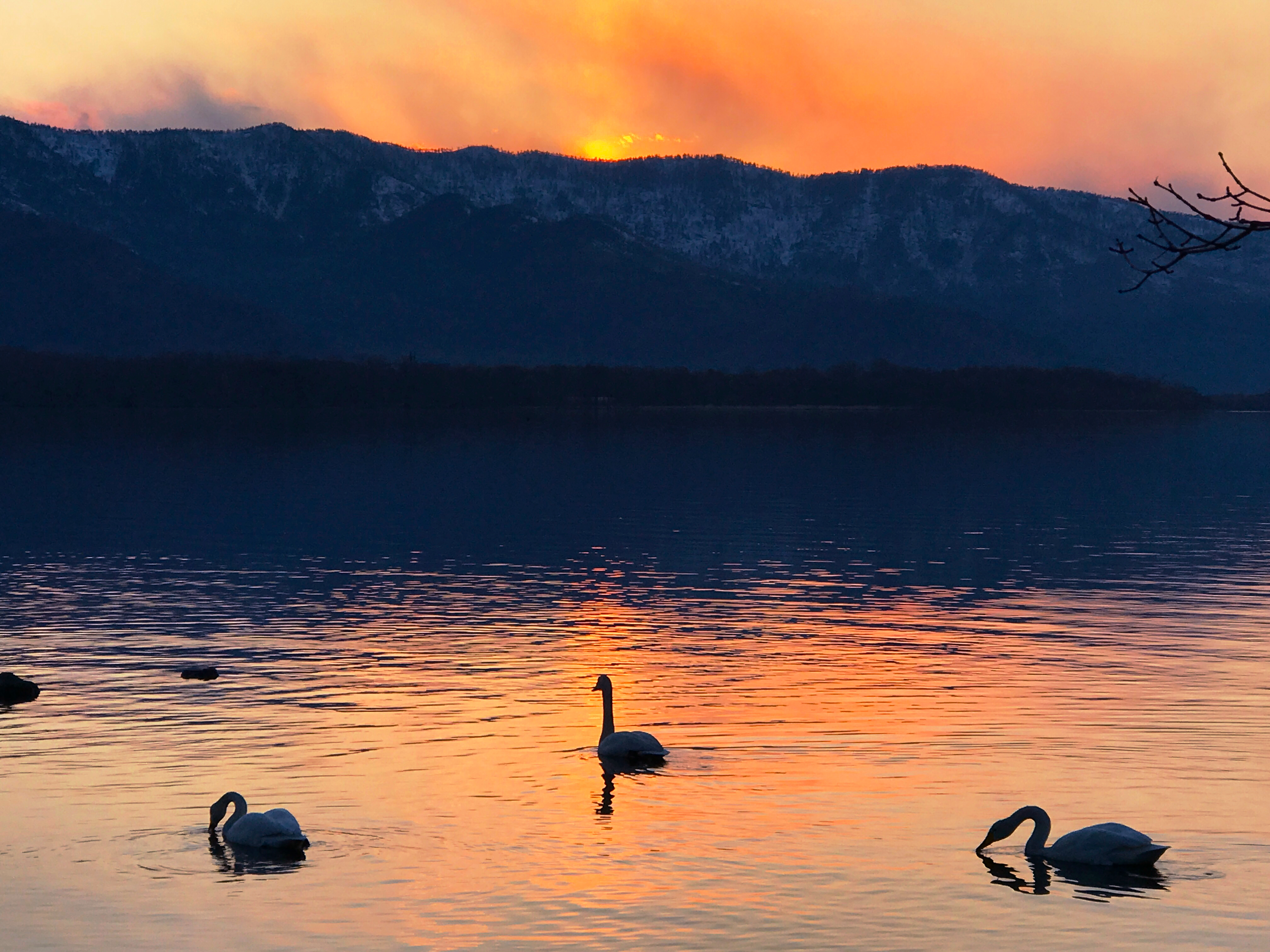 紅い夕日に照らされて白鳥たちのシルエットがとても美しかったです。